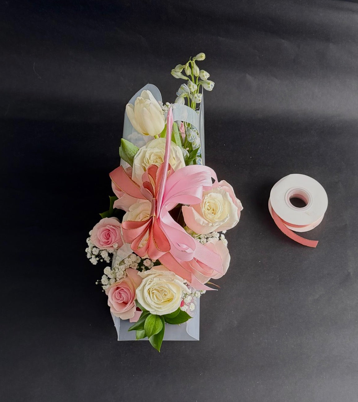 Our favorite version, though? Soft pink and white roses are paired with delicate tulips, airy gypsophila, and fresh seasonal greenery for the perfect bundle of joy (literally)❣️ The best part is that it all fits inside a translucent purse, easy for you to pass on to your loved one. Finished with a flowing pink satin ribbon edged in gold and a charming cupid emblem, this arrangement feels like a gift plucked straight from a myth.