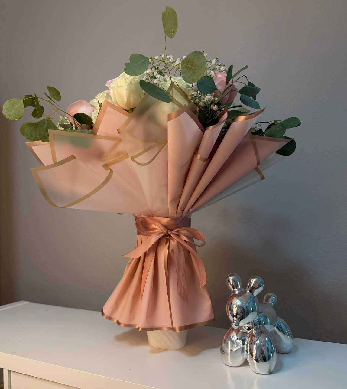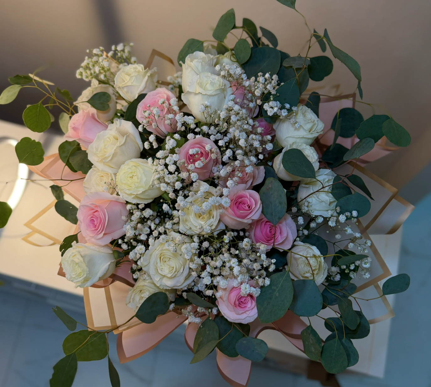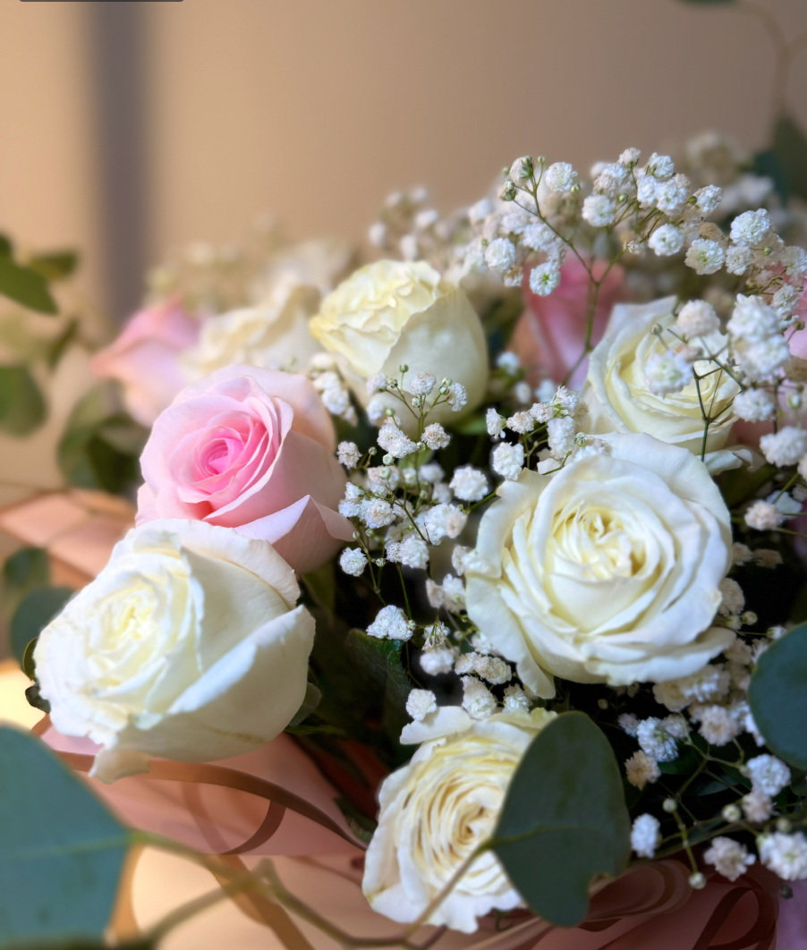 Approximately 25 roses in blush pinks and creamy ivories are nestled among airy baby’s breath and lush greenery, then wrapped and tied with precision. The tight ribbon finish creates a graceful silhouette for your loved one to appreciate.