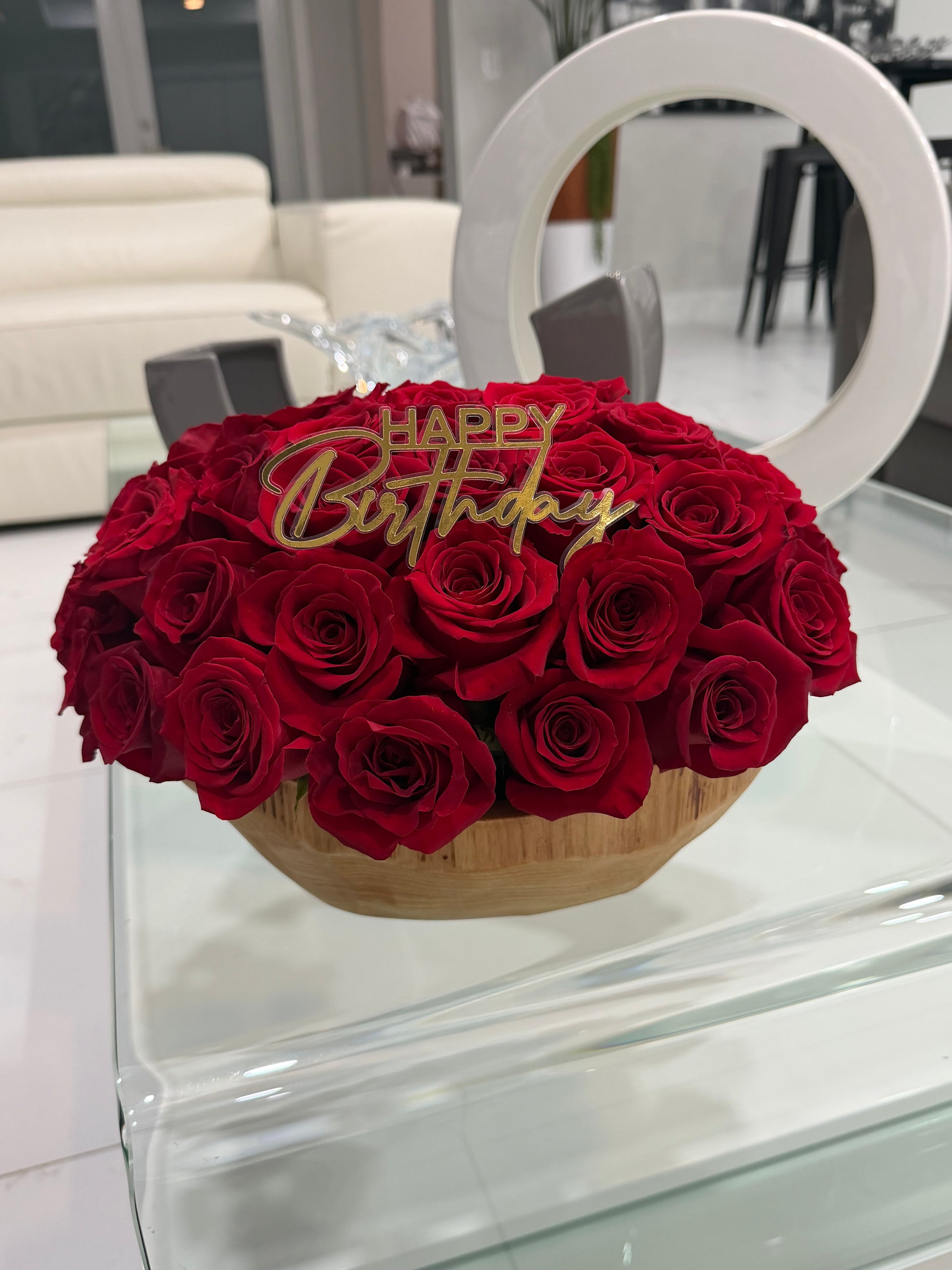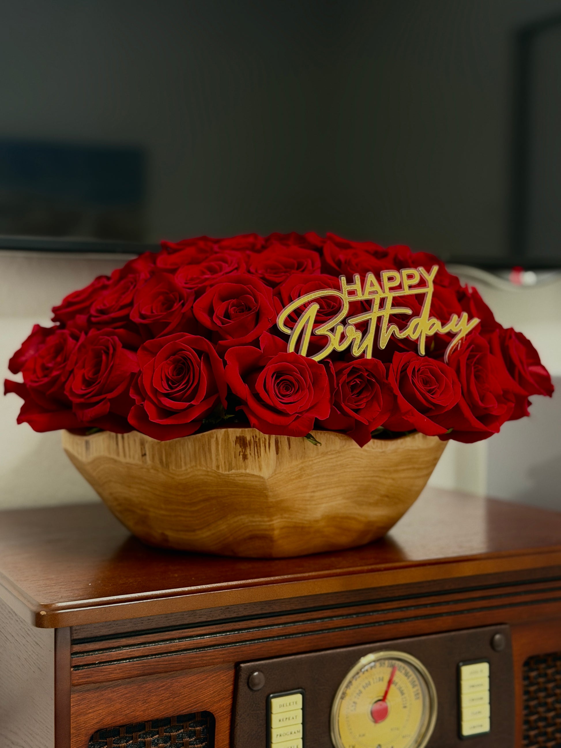 A bold arrangement of 50 lush red roses, composed in a wooden bowl that brings warmth and depth to the design. Simple and filled with emotion for birthdays, anniversaries, and everything in between!