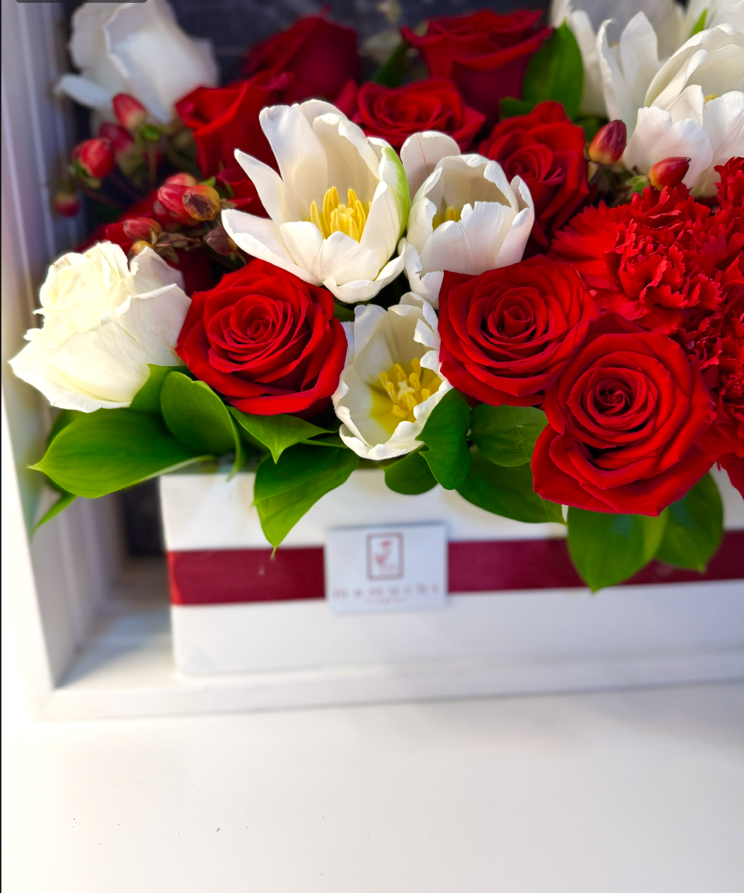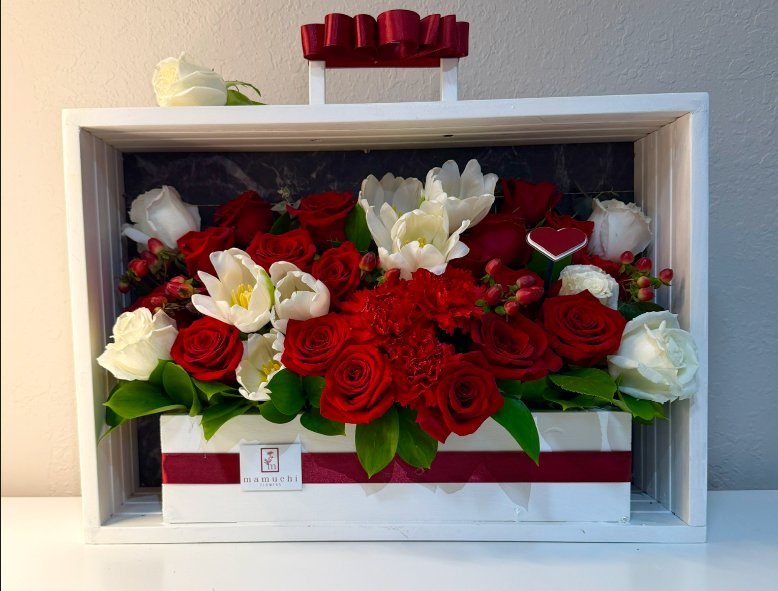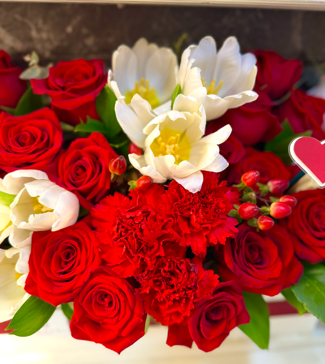 A Mamuchi special, approximately 30 luxurious blooms are arranged with intention and balance inside a hand-crafted wooden box, designed to be treasured long after the flowers fade❣️ Finished with a custom ribbon and refined detailing, this piece feels less like a bouquet and more like a love letter you can hold.